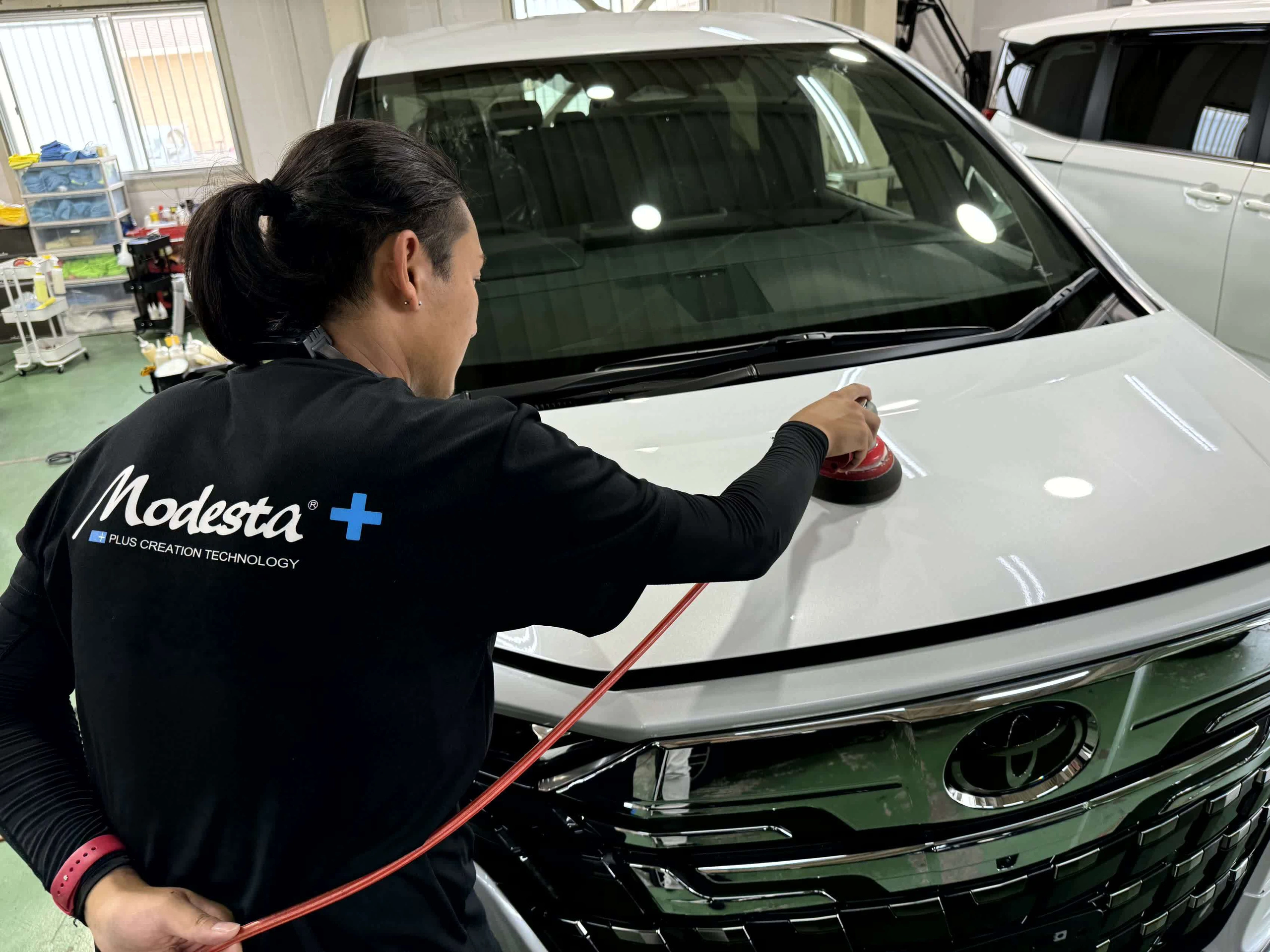 昨今の新型車は塗装が薄く固く作られており、新車時の状態でも80ミクロン程度です。(参考:サランラップ=18ミクロン)弊社では自動車のフェンダーやドアなどパネルのエッジ部分で塗装が薄いと思われる部分をマスキングテープで保護します。また塗装に近い成分のモデスタP-01A特殊樹脂コートを使用して、微細な傷は樹脂で埋めて必要以上に研磨を行わないようにしています。